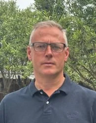 Simon Holland, wearing glasses and a navy blue polo shirt standing outdoors with green trees in the background.